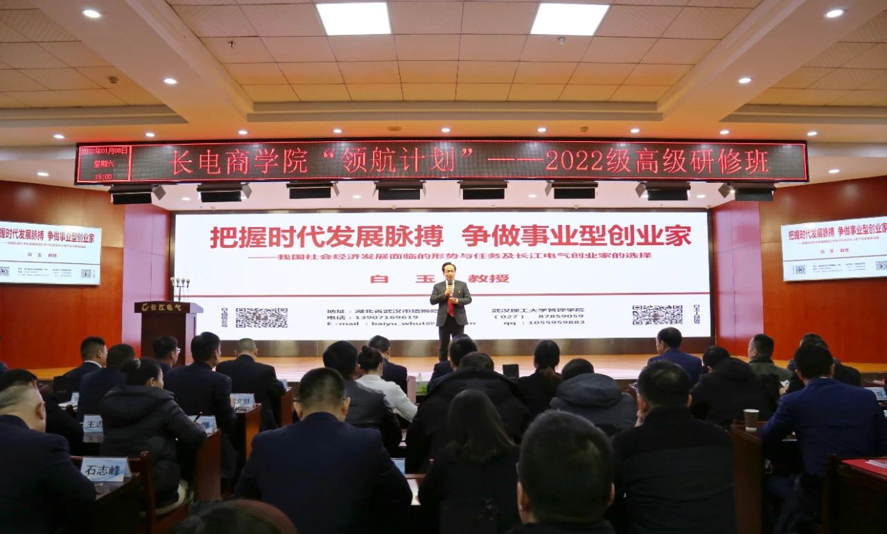 1月8日,长江电气“领航计划——2022级高级研修班”正式开班,公司党委书记、董事长王新城,星空电子商学院名誉院长、著名管理专家白玉教授,及全体经营管理层干部共同开启了为期一年的学习之旅。
