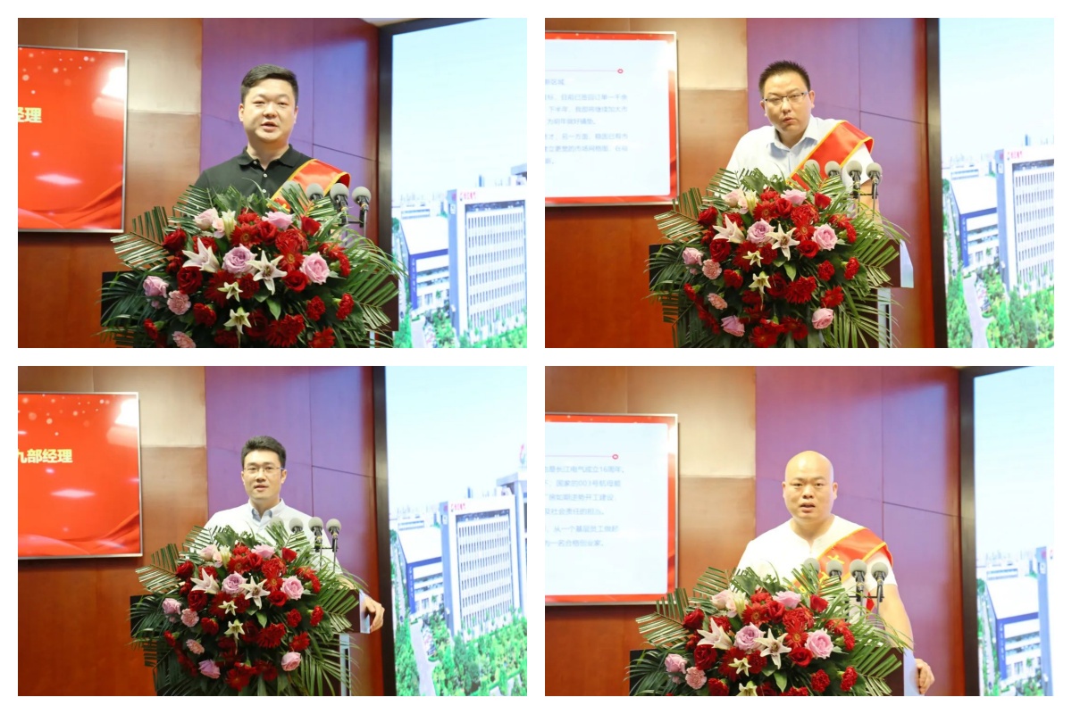 百舸争流,奋楫者先。上半年虽然面临经济下行压力,长江电气创业先锋们,仍意志坚定,逆势而上,奋力拼搏。大会还表彰了创业发展公司2022年第二季度12位订单过千万元创业先锋,创业一公司王建平总经理、创业二公司邱露经理、创业四公司唐鹏程经理、创业九公司吴立明经理四位80、90后创业家作为创业先锋代表,分享了他们“百折不挠,敢为人先”的创业故事。