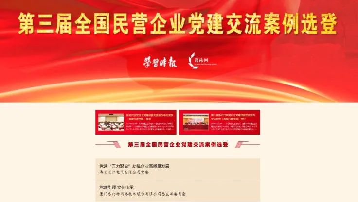 2023年3月-6月,理论网及《学习时报》共同发布第三届“全国民营企业党建经验交流会”征稿启事,面向全国征集民企党建工作经验与创新案例。长江电气党建工作实践入选该案例集,并于9月7日在理论网“民企党建案例”专栏第一条进行了选登。