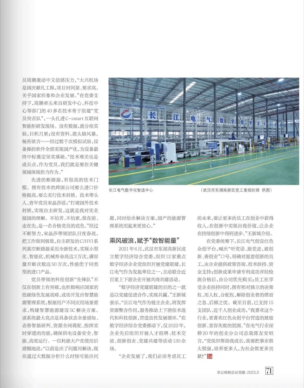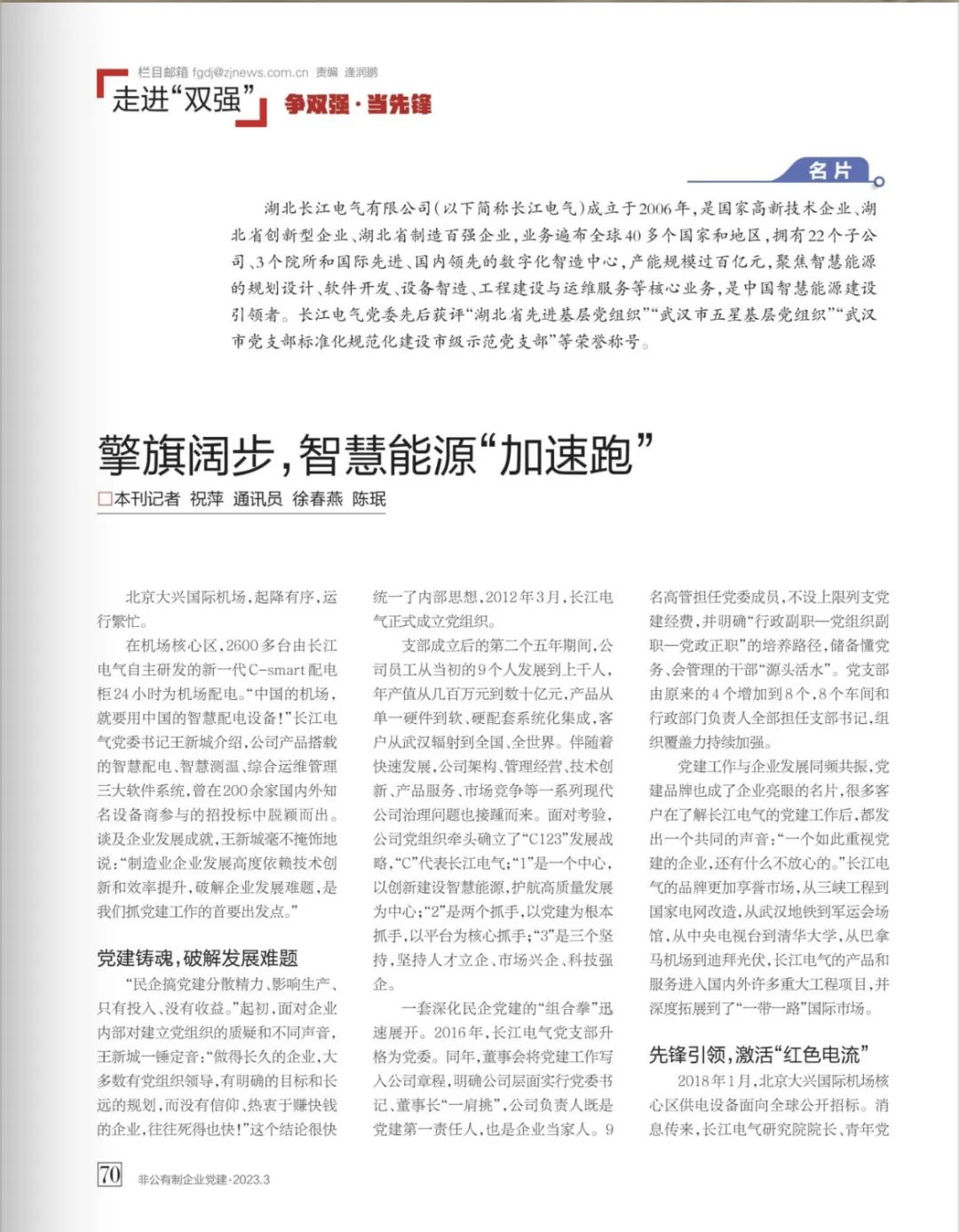 2023年3月《非公有制企业党建》杂志,在“走进双强——争双强?当先锋”栏目,以《擎旗阔步,智慧能源“加速跑”》为题,聚焦报道长江电气在“红色电流,数智能量”党建工作法之下,如何以高质量党建引领企业高质量发展事迹。