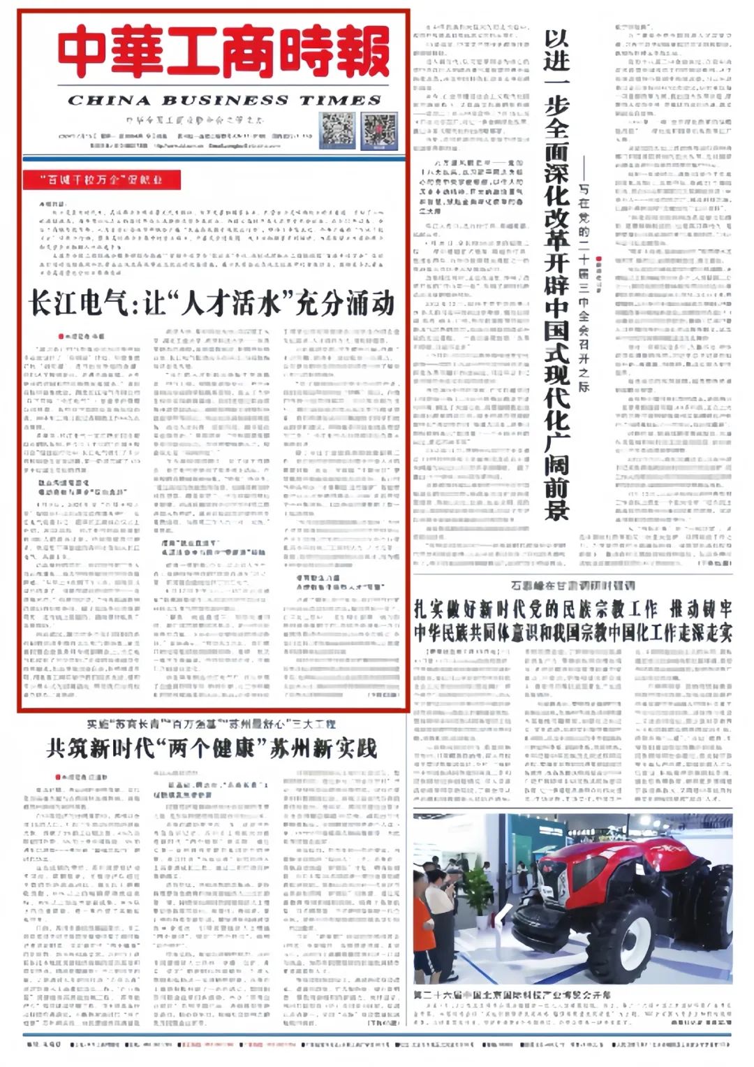 《中华工商时报》头版头条报道长江电气——让“人才活水”充分涌动